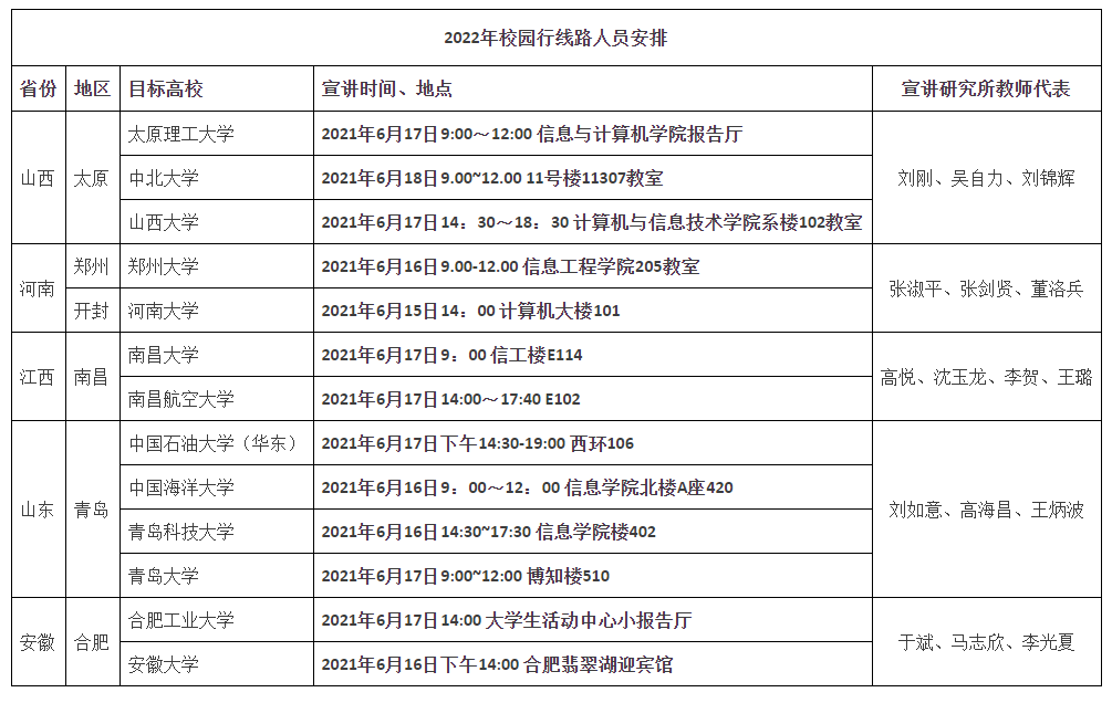 6月15-18日,学院依托8个研究所,组织16名专业教师分5条线路赴全国13所目标高校开展现场招生宣讲活动。活动分为三部分,导师团队介绍学院基本情况及招生政策、推免生复试和现场答疑。为了提高宣讲活动影响力,学院通过官网和官微、校研究生院学院官微发布宣讲预告,利用志愿者在目标高校的宣传栏、BBS等途径进行宣传。本次活动吸引280余名意向学生参加,学院还为到场学生发放了印制的招生宣传手册,活动现场学生踊跃提问,气氛热烈。共有200名学生参加推免生面试,最终为153名学生发放了学院推免接收函。