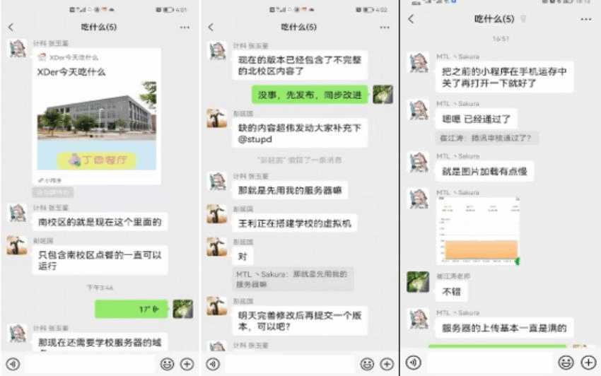 针对小程序运行之初,访问带宽受限、并行处理能力弱、小程序发布审核时间久等问题,nba篮球竞彩购买平台崔江涛教授、彭延国副教授带领研究生一起帮助张玉鉴加班加点提供解决方案,设计了支持高并发的部署方案,统筹协调计算中心开辟了专用虚拟服务器资源,争分夺秒完成了应用迁移,同时联系腾讯公司加速小程序审核,确保了“XDer今天吃什么”小程序及时发布。目前云选餐服务可以正常使用,后续将根据同学们的建议进一步完善相关功能。