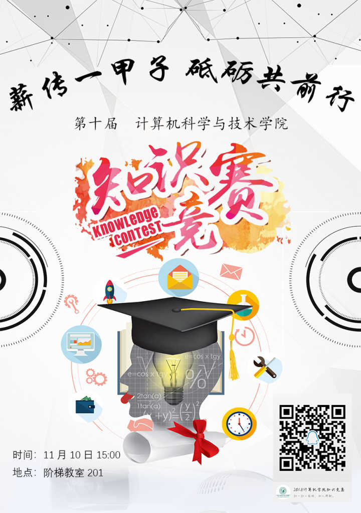 nba篮球竞彩购买平台第十届知识竞赛来啦!本届知识竞赛以“薪传一甲子,砥砺共前行”为主题,旨在纪念我校迁校60周年,增加大家对我校校史及专业知识的了解,丰富研究生的课外活动,为大家创造一个更广阔的平台,同时使大家能够在比赛中收获快乐,收获友谊。此次知识竞赛题型多样,内容丰富,不仅有时事政治,西电历史,同时还有各种类型的百科知识,总有你可以发挥的地方。除此之外,本次知识竞赛还设有丰富的奖品及获奖证书,乐扣保温杯,闪迪U盘,卡通抱枕,各种各样的小玩偶,参与即有奖,只要你来我们就让你不虚此行。11月10日下午三点阶梯教室J201,记得带上你的室友,基友,或者那个他/她,3-5人一组,让我们一起来场头脑风暴吧!大家不见不散哦~更多详细信息,请加入计算机学院知识竞赛QQ群,群聊号码:924146808