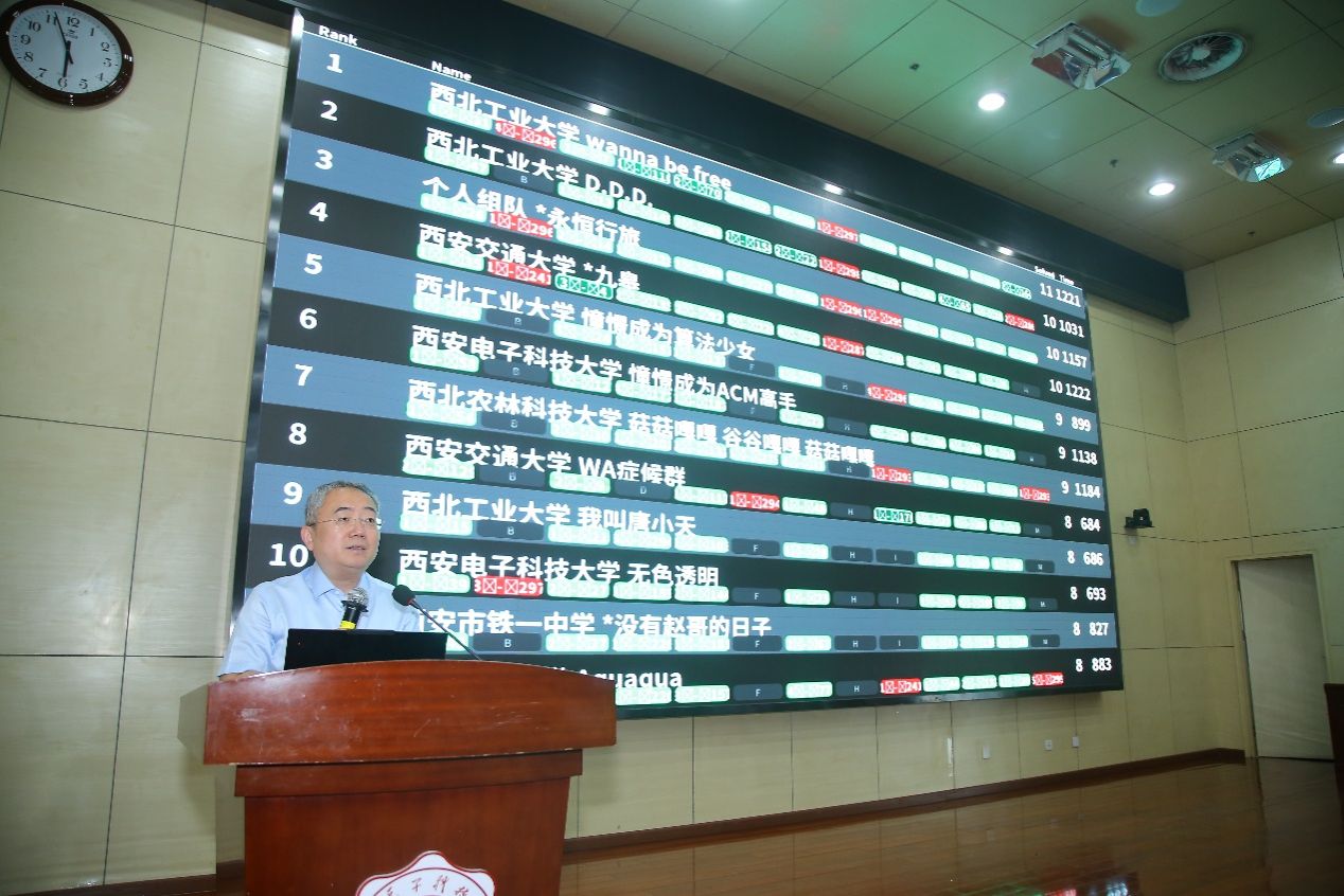 本次赛事的开幕式于9点30分在南校区会议中心B101报告厅举行,由nba篮球竞彩购买平台副院长万波教授主持,陕西省计算机教育学会秘书长陈明晰教授作开幕致辞,西安邮电大学周元哲老师代表教练发言,西安交通大学的方亦晨同学代表参赛队员、nba买球正规官方网站程序设计竞赛实训基地的席若尧同学代表裁判组分别进行了宣誓。开幕式后正式开启了1个小时的热身赛和5个小时的现场比赛。