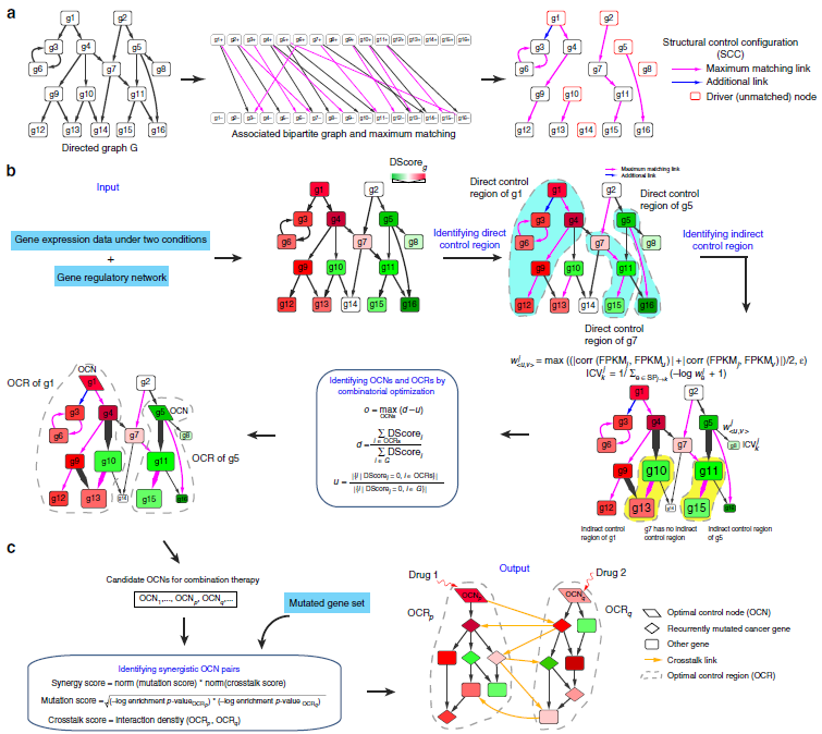 该论文通过使用基因表达作为网络可控性框架中的约束,开发了最优控制节点(OptiCon)算法,这是一个基于网络可控性理论,从基因网络中识别协同调控因子的创新性算法。该算法不需使用药物等先验信息,通过对网络模型上的组合优化问题求解,为疾病联合治疗提供新颖的候选靶标组合。研究者不仅通过计算层面对OptiCon预测结果进行评估,并使用CRISPR/Cas9基因编辑技术对结果准确性进行验证。