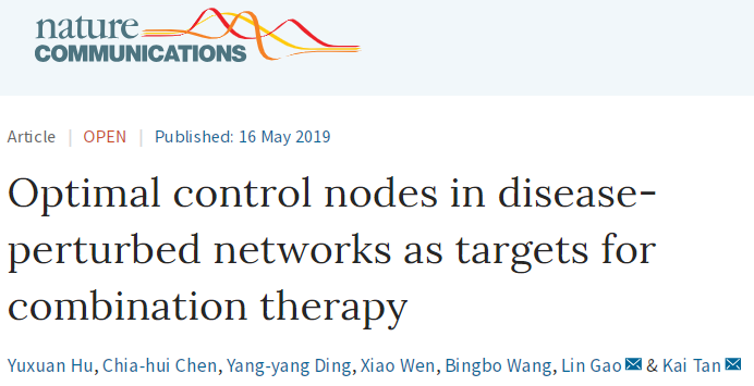 2019年5月16日,我校nba篮球竞彩购买平台高琳教授团队以第一单位在《自然》子刊Nature Communications(影响因子:12.353,中科院一区)上发表研究论文“Optimal control nodes in disease-perturbed networks as targets for combination therapy”。