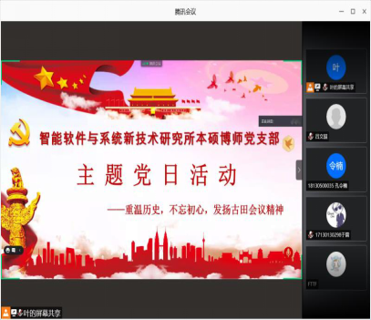 (通讯员 张恒运)为庆祝中国共产党建党100周年,深入学习贯彻习近平总书记在党史学习教育动员大会上的重要指示精神,从党的非凡历程和实践中汲取初心使命的力量,nba篮球竞彩购买平台智能软件与系统新技术研究所本硕博师联合党支部于2021年5月28日下午开展了“重温党史,不忘初心,发扬古田会议精神”主题党日活动。活动由支部副书记吕文琪同志主持,共计56人参加,会议以线上和线下的方式进行展开。