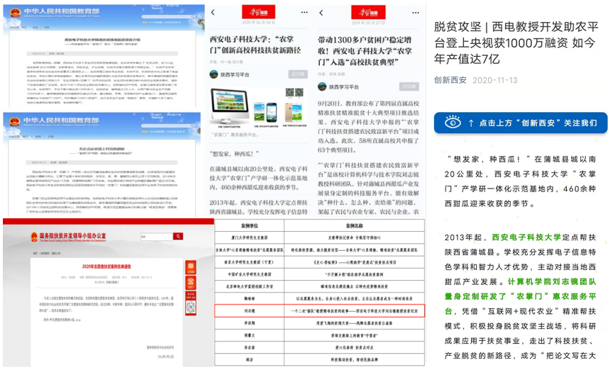 刘志镜教授团队“农掌门”项目获2019年教育部精准扶贫精准脱贫十大典型项目,刘志镜教授扶贫案例获国务院扶贫办“志愿者扶贫案例50佳”。“农掌门”扶贫事迹登上教育部网站专题报道2次、学习强国平台专题报道2次,得到中央电视台等官方媒体报道,如今年产值达7亿。“山货帮”团队疫情不忘脱贫攻坚,1月到4月初帮助贫困户300余户,销售农产品价值逾71万元,惠及社区百姓超过960余户。